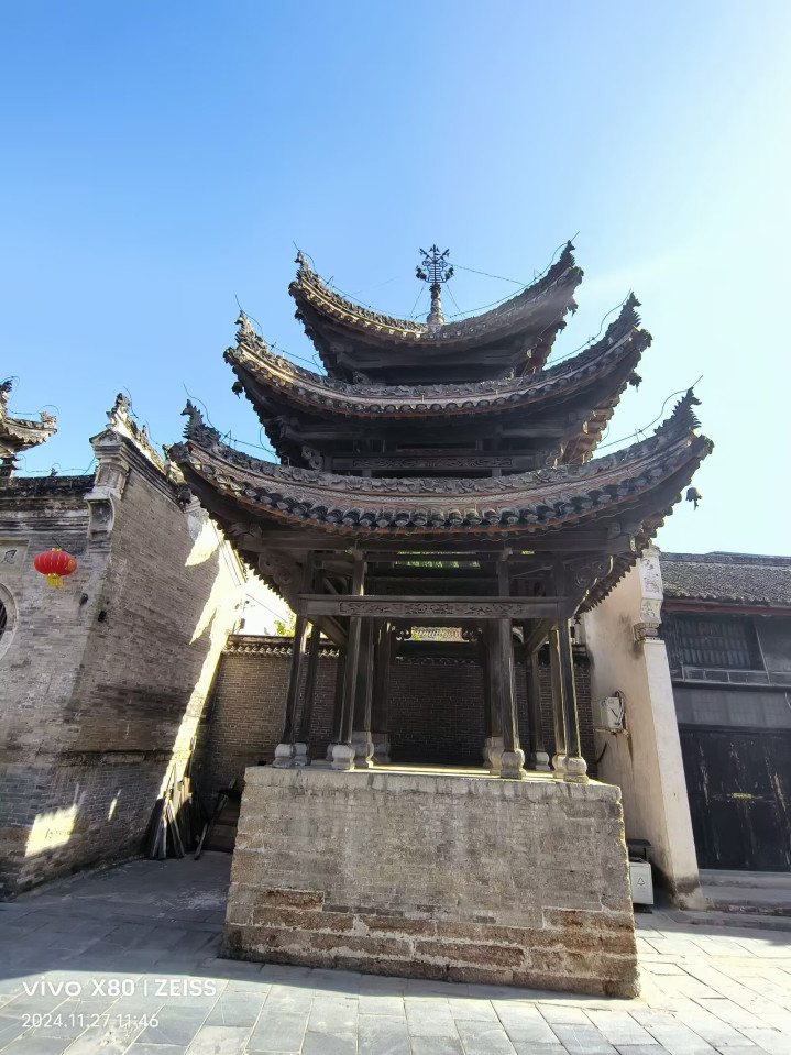 穿过幽静的门洞,是一个豁然活泼的庭院,戏楼、钟楼、春秋阁、后殿依次肃立在深邃的中轴线上,次序井然。