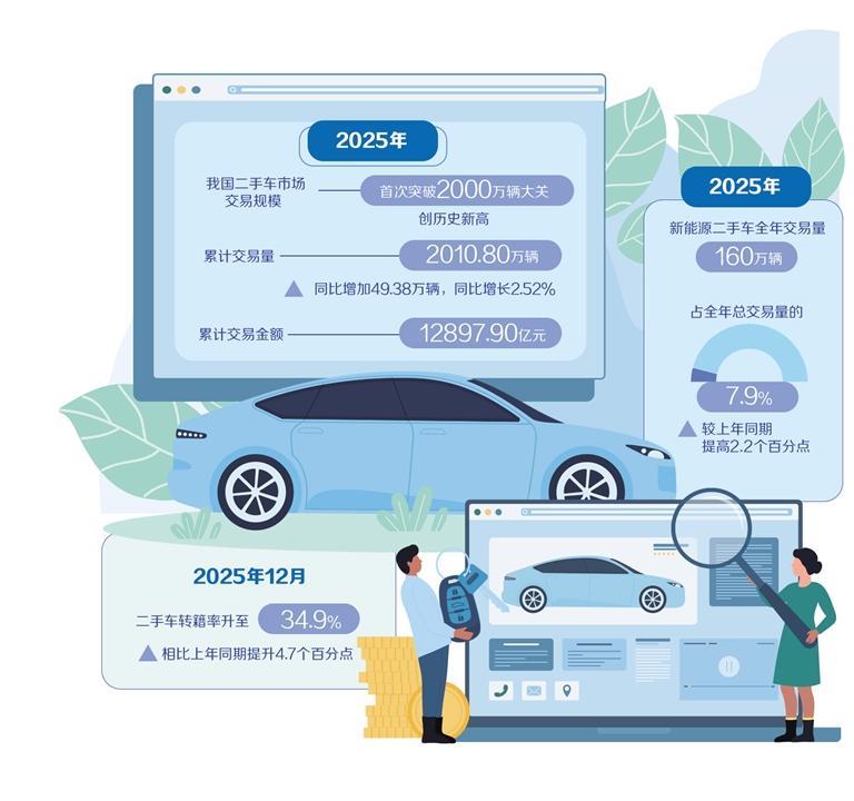 2025年,我国二手车市集来回限制在战略复旧、新能源汽车浸透率耕作与数字化加速等多成分的推动下,初次突破2000万辆大关,创历史新高。中国汽车流畅协会最新数据骄傲,2025年二手车累计来回量2010.80万辆,同比加多49.38万辆,增长2.52%,累计来回金额12897.90亿元,市集体量与来回价值同步攀升。自2016年起,历经10年发展,二手车来回限制完满从千万辆到2000万辆的量级跳动,彰显出建壮的发展韧性。