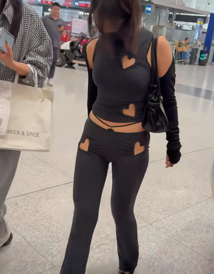 赵奕欢穿戴认知套装,看着像瑜伽服,不外衣服的野心如实很相配,带有好多镂空的爱心,裤子上也有两个小爱心。