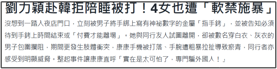 雷同在首尔渊博,网红康康和一又友进了一家夜店,一进场就被戴上了手铐,给了她们两个采取,要么在夜店待平直铐自动解开,要么给钱开放手铐,康康一溜东谈主试图离开,就和刘力颖一样被打了。