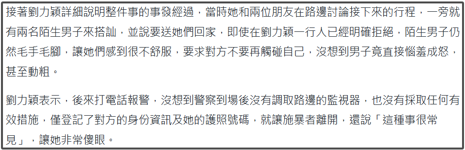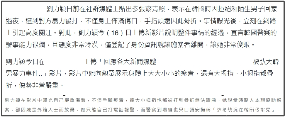 刘力颖我方报了警,韩国考察尽然不作念任何贬责,让她回家休息,还宣称她遇到的情况在韩国很常见。