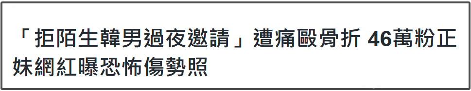 ——如故莫得作念错任何事的情况下,仅仅拒却了韩男搭讪,就被打到周身淤青,手指头王人骨折了。