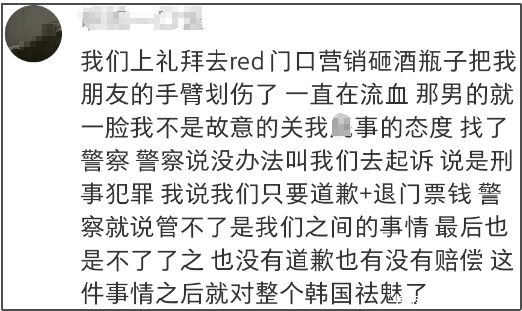 有东谈主被韩国酒吧保安打了,没东谈掌握;有东谈主在韩国被酒瓶子砸到流血,没谈歉没补偿。