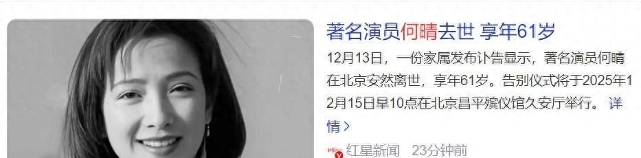 盛名扮演艺术家何晴被证实于北京巩固离世,常年61岁。