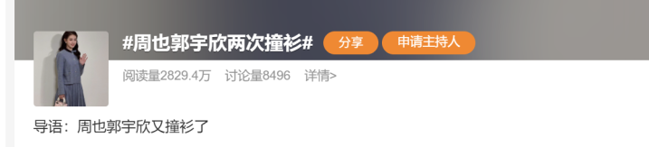 女明星其实很发怵撞衫,坊间有一种“撞衫不能怕,谁丑谁狼狈”的说法,郭宇欣、周也两次撞衫后成功冲上热搜,网友怨声满说念。