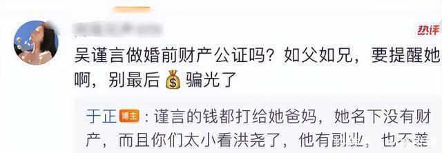 然而于正公开给全球一个定心丸。吴谨言并不是恋爱脑,她的钱齐上交给了父母收拾,她的名下莫得财产。洪尧也有我方的副业,还不差钱。 于正的意思意思即是吴谨言和洪尧的经济是零丁的。于正的话,含金量确实不高。前一秒说洪尧不差钱,后一秒说东说念主家买不起屋子。 那就不知说念吴谨言是否有作念过婚前公证。思起了金莎和小9岁的男友孙丞潇说过j9九游会,异日成婚的话,一定会去作念婚前财产公证。 这亦然保护女方不受伤害的一种形势。 其实细品,就会发现吴谨言其实并不是恋爱脑。谁规章女艺东说念主就一定要嫁入权门,她有钱零丁,十足不错嫁给爱情。 仅仅她的全国太过于浅薄了,她十足不知说念女子下嫁是要付出何等大的代价。 齐说经济基础决定表层成就和言语权。 吴谨言的收入高,老公的言语权当然就弱。 遥遥无期,良伴俩笃定会因为资产会有摩擦的。虽然,吴谨言还不至于像普通女子不异,婚后需要为钱而吵架。 然而在这一段婚配中,吴谨言从此就要作念好靠我方的准备了。 因为她这一辈子也许齐依靠不了她的老公。