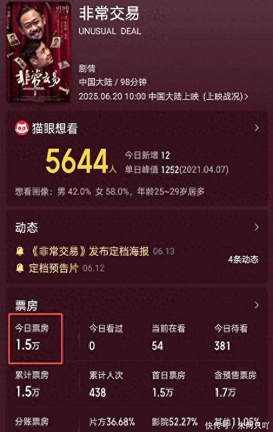只是几个小时后,其票房收入仅为1.5万元,不雅影东说念主数不及500。