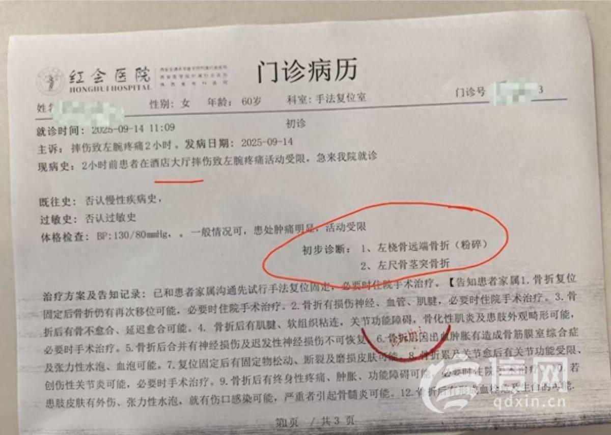 据发帖东说念主反应,9月14日上昼他的父母要到货仓的前台退房,其时保洁员正在打扫,大地上有水,但莫得拓荒教唆牌,母亲途经时滑倒摔伤。送到病院后,老东说念主被会诊为左桡骨远端骨折(翻脸)、左尺骨茎突骨折。