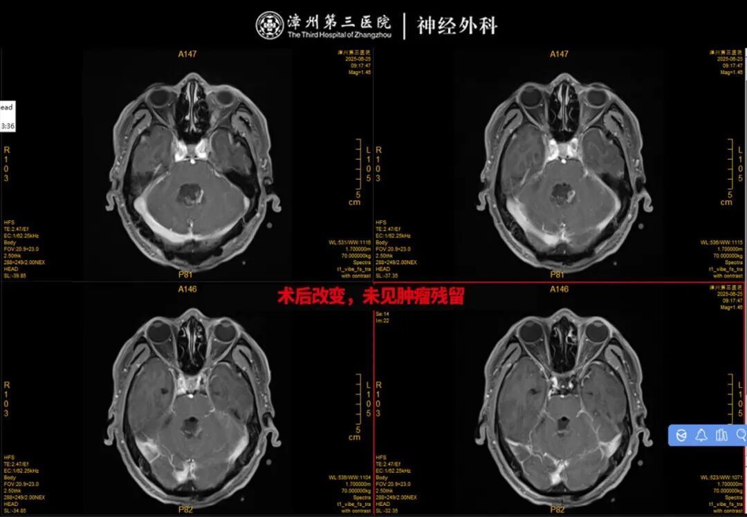 手术本日,在林友城副院长的领导下,手术团队凭借丰富的临床训戒和深通的技巧,环环相扣地操作。他们防御翼翼地分辨病变与周围神经血管的粘连,精确遁藏脑干及伏击功能区,徐徐将占位病变完满切除。扫数手术经由弥留而有序,最终成功完成,术中出血量少,未对周围正常组织变成毁伤。