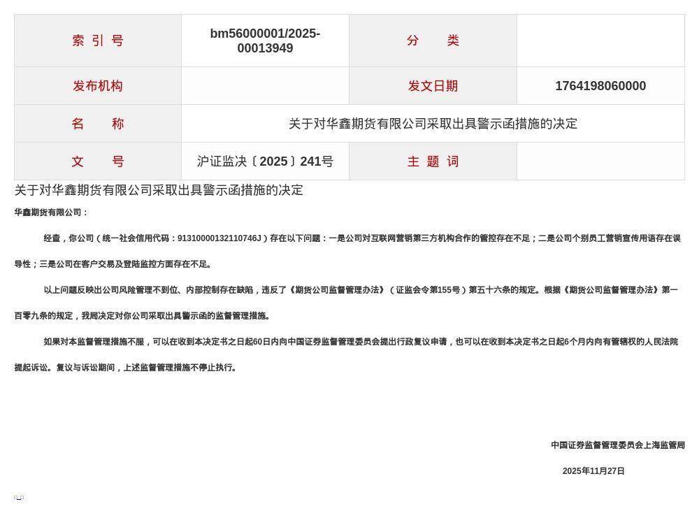 蓝鲸新闻12月3日讯,近日,中国证券监督措置委员会上海监管局发布了行政监管标准决定书,剑指华鑫期货有限公司。