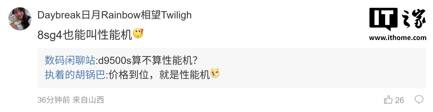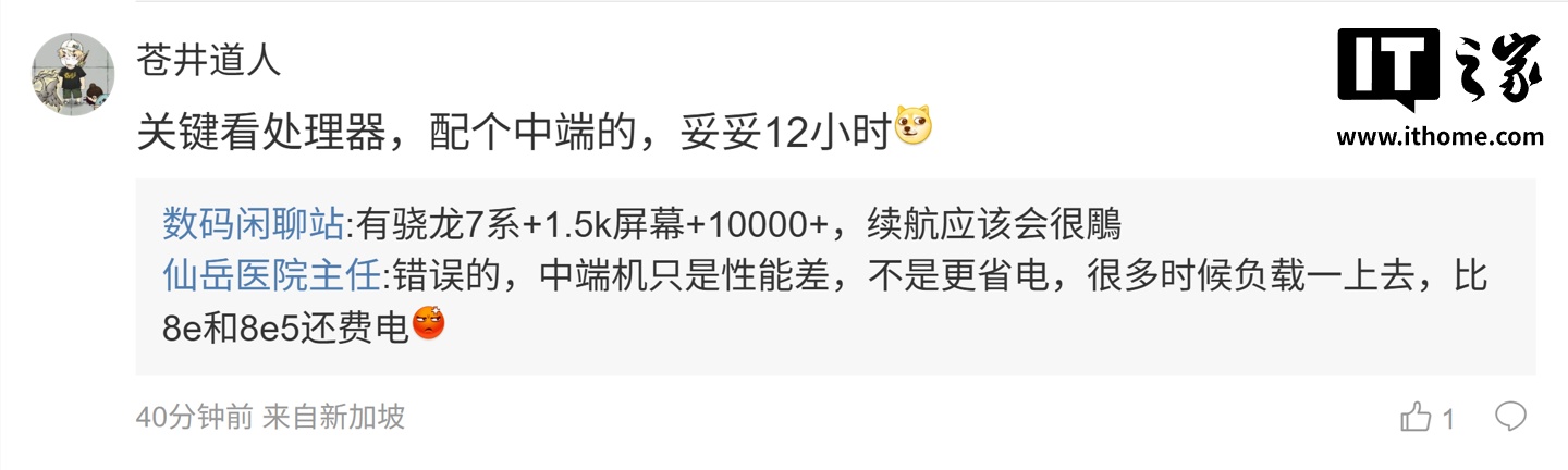后续灵验户在评述区涌现:“8sg4 也能叫性能机”,博主回答说念:“d9500s 算不算性能机?”;另又名用户则涌现:“关节看处分器,配个中端的,妥妥 12 小时”,博主则回答说念:“有骁龙 7 系 +1.5k 屏幕 +10000+,续航应该会很鵰”。