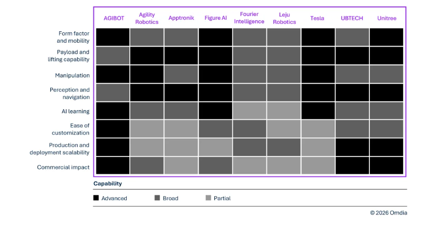 Omdia 对通用型具身智能机器东说念主厂商的热力求评释如下: