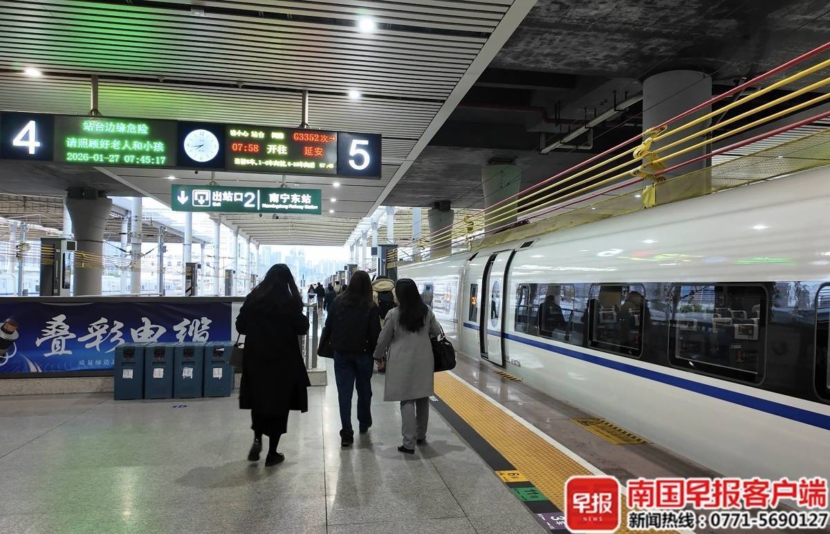 1月27日,南国早报全媒体记者从国铁南宁局获悉,今日上昼7时58分,首趟南宁东至延安的动车组列车G3352次驶出站台,标记着绿城南宁与翻新圣地延安杀青高铁纵贯,填补了两地无直达高铁的空缺。
