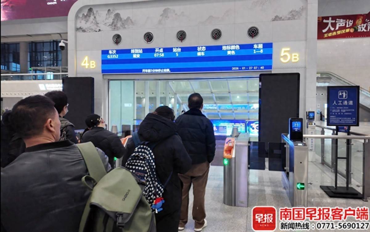 1月27日,G3352次搭客在南宁东站列队准备检票进站。林世杰摄