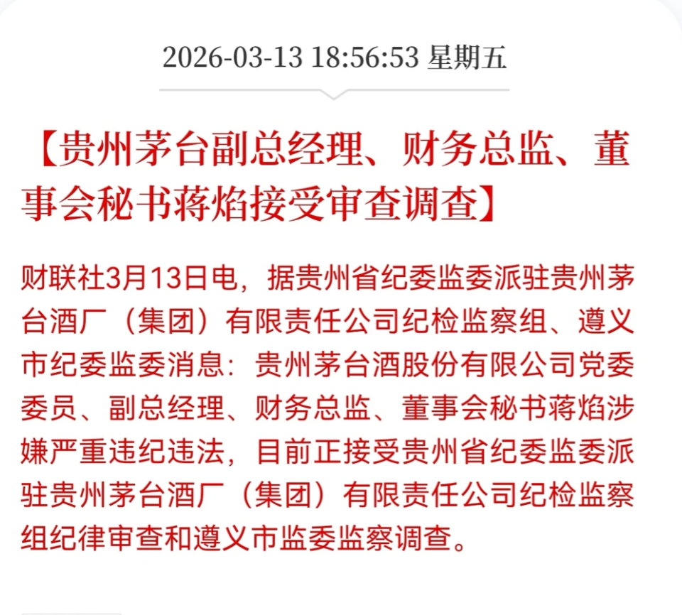 9)茅台董秘被查。贵州茅台公告称,公司于2026年3月13日收到遵义市监察委员会对于对公司副总司理蒋焰实施留置的见知。公司出产狡计宽泛有序,公告事项不会对公司出产狡计惩办产生紧要影响。面前,由公司董事长陈华代行董事会通告责任。