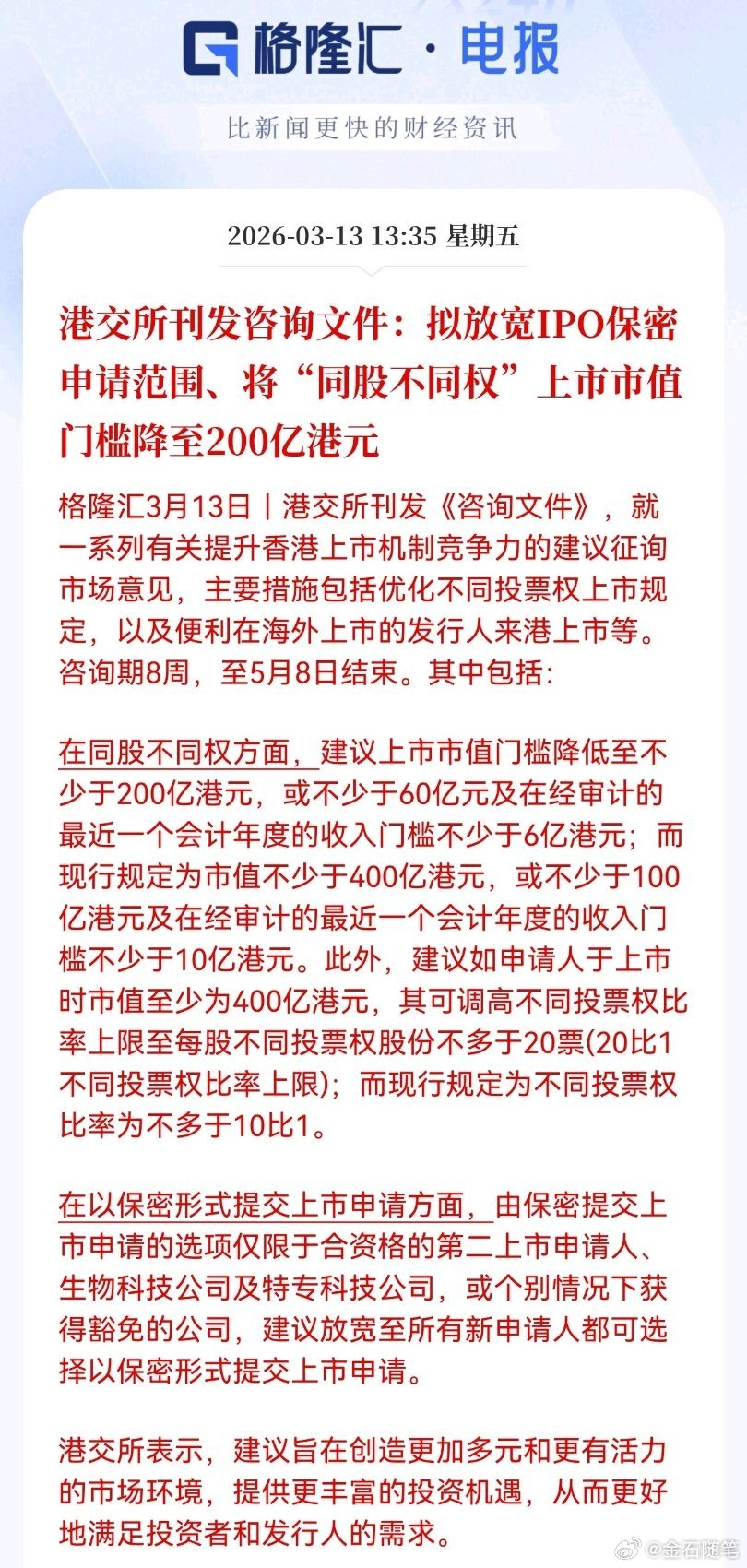 6)港交所发布商讨文献:逆放宽IPO笼罩范围,镌汰同股不同权上市门槛。其中提到,笼罩上市肯求建议从第二上市肯求、生科及特专企业放宽至统统肯求上市企业。